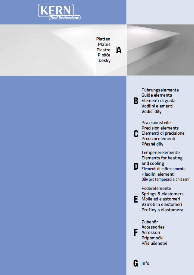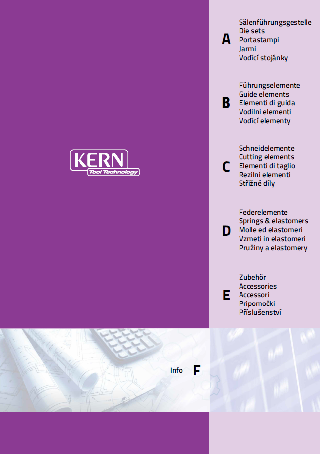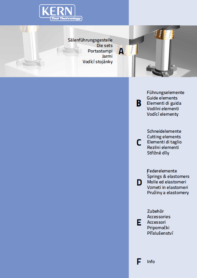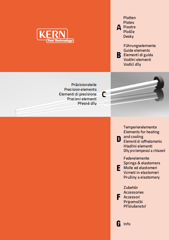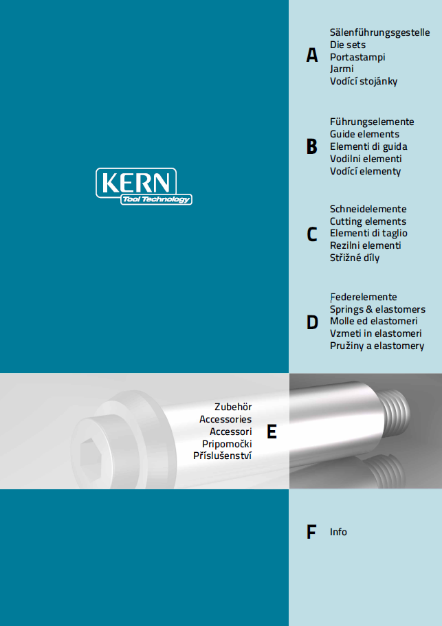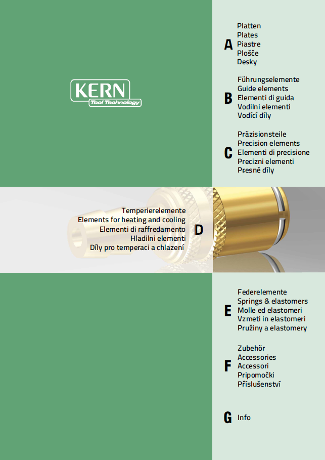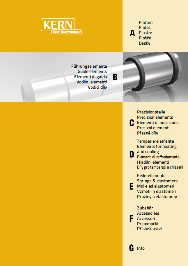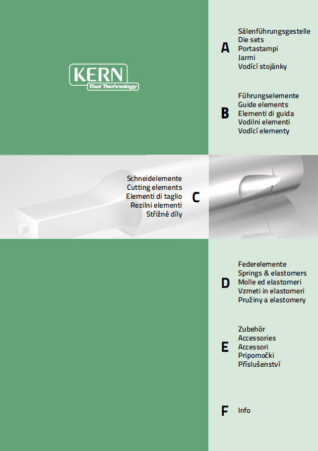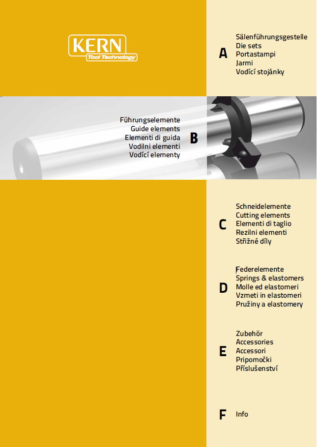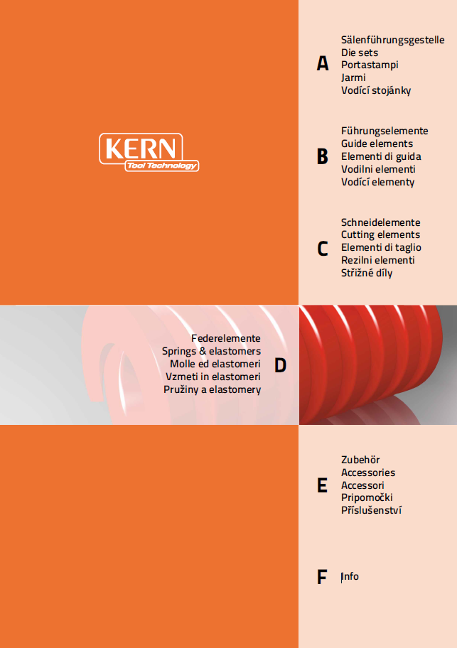 KERN catalogues Tools fixtures and machinery Die sets Guide elements Cutting elements Springs & elastomers Accessories Info Injection, compression and diecasting Plates Guide elements Elements for heating and cooling Precision elements Springs & elastomers Accessories CVe monitor PROGRESSIVE Bold 3 YUDO CW 662 YUDO Gas springs SPECIAL SPRINGS Compression springs SPECIAL SPRINGS Downloads